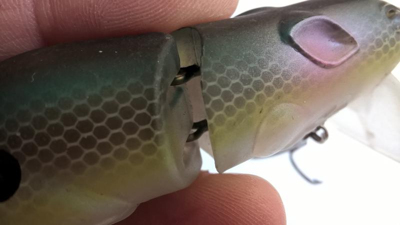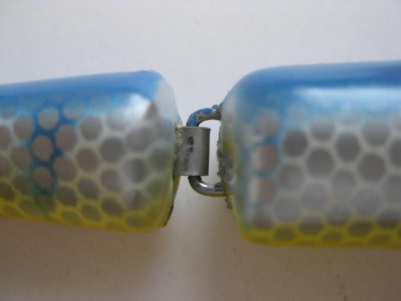 Polaczenie czlonow w obydwu woblerach jest identyczne. Przez srodkowy czlon przechodzi blaszka o dlugosci 3,4 cm, szerokosci 5 mm oraz grubosci 2 mm. Blaszka jest w srodkowym czlonie (2 cm dlugi) od dolu na sztywno zamocowana przez metalowy gwozdzik. Przedni czlon (7 cm dlugi) oraz tylni czlon (3,5 cm dlugi) sa w ten sam sposob od dolu zamocowane, jedynie nawiercenia otworow w blaszkce dla gwozdzikow sa wieksze, aby obydwa czlony mogly sie swobodnie poruszac. Poniewaz woblery ( obydwa 12,5 cm dlugosci) wykonane sa z drewna, wszystkie trzy gwozdziki sa mocno w nie wbite.