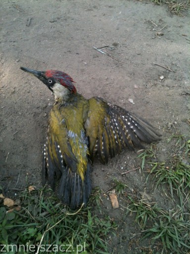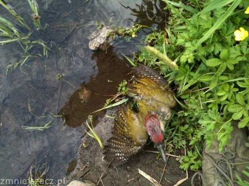 Dzisiaj nad wodą usłyszałem jakiś przeraźliwy krzyk. Po przyjściu na miejsce okazało się, ?źe w wodzie topi się jakiś ptak pr?łbując z niej wyfrunąć, ale co wystartuje coś go wciąga z powrotem. Szybka akcja i ptak jest na brzegu, ale wręcz obwinięty jakimiś śmieciami oraz ?źyłką. Szarpiąc się zdarł sobie do sk?łry wszystkie pi?łra z brzucha. Po uwolnieniu wytarłem go, ale przez ponad godzinę siedział trzęsąc się niemiłosiernie. Nie mogłem na to patrzeć i po uzyskaniu namiar?łw z wrocławskiego zoo zabrałem do domu, gdzie mał?źonka odwiozła przera?źonego ptaka do ekostra?źy. Ptak to rzadki dzięcioł zielono-siwy. Podobno prze?źyje