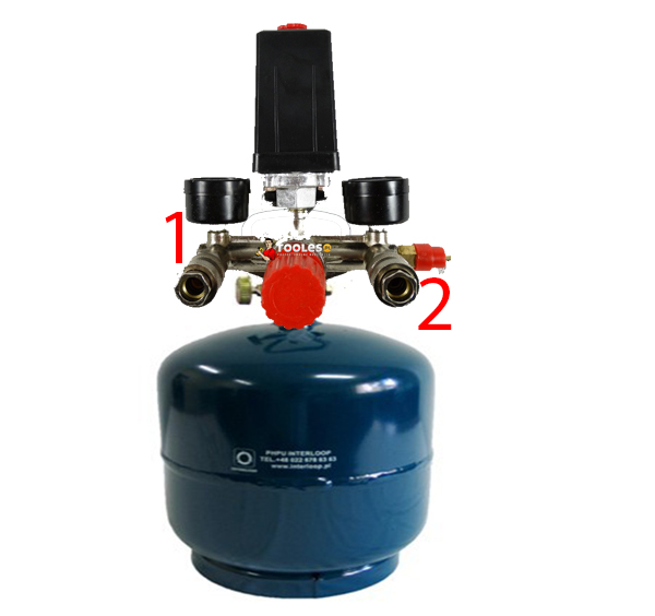 Zrob tak jak kolega prawi. Nie znam tych wlacznikow, musisz spr. podepniej najpierw do 1 potem do 2 i zobaczysz co sie bedzie dzialo. Jesli mozna to zmniejsz cisnienie zalaczanie agregatu na 5 atm. bo szybko zajezdzisz agregat. Praktycznie odp. sobie sam, spr. tylko ktora koncowka pokazuje cisnienie w butli, daj jeszcze fitlr przed areografem i bedzie ok.
