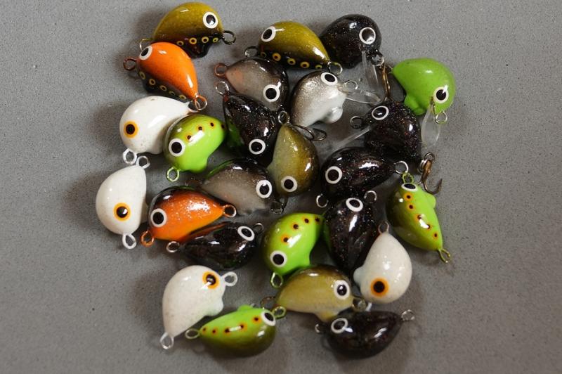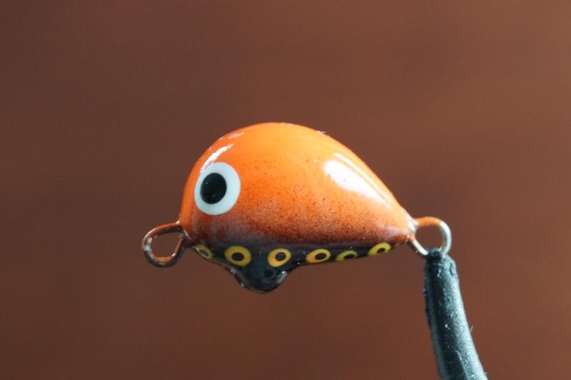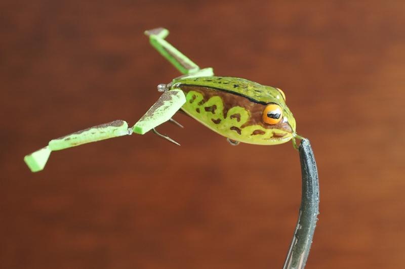 Rozwiązanie, które proponujesz na zarośnięte płycizny byłoby ok ale ta żabka jest za mała (korpus ma 28 mm) i byłby probem z wyważeniem przy dużym haku dodatkowo skierowanym do góry. Przez te nóżki, już w tej wersji czasem jak "plaśnie" na plecy miewa problem z odwróceniem się do normalnej pozycji. Planowana była na rzekę, wiec kotwiczka w dół nie przeszkadza.
