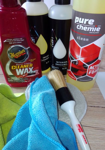 Trochę czasu wolnego więc postanowiłem "odkurzyć" cześć arsenały wędkarskiego. Miało być przemycie alkoholem(w końcu wszyscy mamy go w domu w nadmiarze), a skończyło się na użyciu kosmetyków, które służą mi do mycia auta. Najpierw rozcieńczyłem aktywną pianę i przy pomocy pędzelka przemyłem blank oraz przelotki, tu trzeba było się zatrzymać na dłużej. Dokładnie z każdej strony popracowałem pędzelkiem by dokładnie wymyć brud z najdalszych zakamarków. Kolejnym krokiem było czyszczenie rękojeści i uchwytu kołowrotka. Tutaj zastosowałem preparat do czyszczenia wnętrz( plastików, gum, tapicerki materiałowej). Jest delikatniejszy niż aktywna piana a nie wiedziałem jak się zachowa pianka czy korek potraktowany ostrzejszą chemią. Tu z pomocą również przyszedł pędzelek. Po wszystkim wędki zostały  opłukane czystą wodą i osuszone ręcznikiem z microfibry. Po dokładnym wysuszeniu na blank został nałożony cleaner wax a całe rękojeści(pianka, korek, korkoguma, uchwyty kołowrotka) pokryte zostały dressingiem do wnętrz.