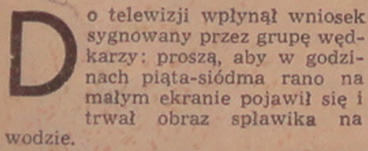 S. Cios Opublikowano 7 Listopada 2021 Autor Zgłoś Udostępnij Opublikowano 7 Listopada 2021 A to jest początek artykułu. 1975, Kultura. Dla młodego pokolenia: w tamtym okresie program TV nadawano tylko w określonych godzinach, bodajże od 7.00 rano do ok. godz. 24.00. W pozostałym okresie na ekranie wyświetlano jakieś zdjęcie (na Śląsku było z szybem kopalni). Stąd ten pomysł ze spławikiem.[p.s. poprzedni post zawiera tylko fragment długiego artykułu] 4 Cytuj Odnośnik do komentarza Udostępnij na innych stronach Więcej opcji udostępniania...