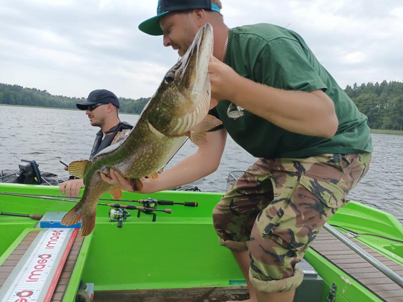 Szczupson z soboty. Pacnął w trzecim rzucie około godziny 14:30, koledzy się jeszcze motali przy rozkładaniu zestawów.  Siedział na głębszej wodzie przy górce z 7m na 4m. Chyba pomału zaczynają się ruszać po tych upałach. Poprzednie dwie wyprawy na prawie zero (nie licząc malucha 60cm)