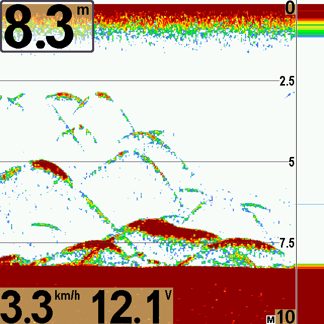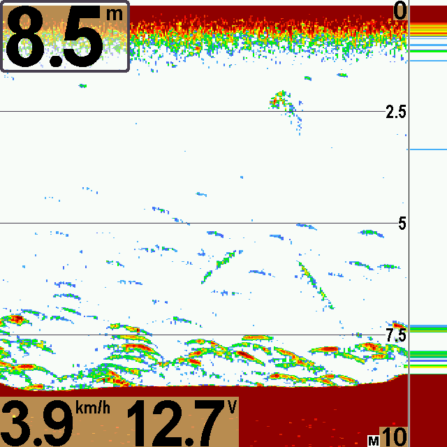 za to dosyc czesto na ekranie widac moje przywieszki i ciezarek (nie duze moze z 2-3cm dlugosci na haczykach powiedzmy 1/0 4 sztuki + ciezarek okolo 100-150g) widac wyraznie kazda przywieszke w toni i na dnie na okolo 15-17m (na ekranie sa paski, echo tak mocne, ze az czerwone).
