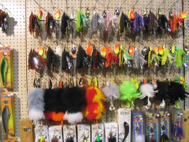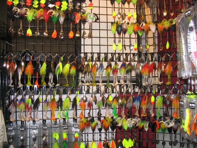 . Niebieska Legenda w moim reku mowila wszystko . Jim wlasnie te nowa serie reklamuje w sobotnich programach o muskie . Reklamuje tez nasze Salmo . W te sobote lecial 6 odcinek wlasnie w tym momencie jak smyczylem sie po wystawie . W kazdym z tych odcinkow Jim lowi z roznymi Mistrzami i prawde mowiac az sie prosilo by w jednym takim gosciem byl nasz Pepe . Moze bedzie w ktoryms nastepnym ? . Generalnie wsrod przynet widac jak rozwijaja sie gumy . Nie dosc ze sie rozwijaja to sa laczone z wirowkami , blachami , spinnerbaitami i woblerami . Wiekszosc firm idzie w kierunku tych mezaliansow . Salmo do dzis konserwatywnie trzyma sie swojej drogi . A moze maja cos w planach ?. Oprocz lodgy , guidow , lodzi i calej masy przynet moja uwage zwrocily dwie rzeczy . Pierwsza to blacha wahadlowa na stanowisku Colby Simmsa . Piekna , duza , wytloczona w raby imitujace luske z mala komora a w srodku kulki . Wybralem jedna srebrna ...chetnie ja wyprobuje . Druga rzecz to specjalne rozwiazanie antyzaczepowe . Kazdego z nas dopadaja takie mysli antyzaczepowe jak rosliny czy galezie zpowoduja utrate ulubionej przynety . Patent ten ma dwa dobre rozwiazania ; w chwili transportu sprezynki sa na ostrzach hakow i sie nie tepia , nie kluja , nie placza . Natomiast w momencie lowow sprezynki uwalniamy aby wystawaly ponad haki i to pozwala nam bezzaczepowo je poprowadzic . Wlasciciel tego patentu Ted Rydel zademonstrowal mi to przeciagajac wabika po rece . Wygladalo to wiarygodnie . Kupilem kilka duzych kotwic bo Yoko mi robi duza zabe i trzeba by ja jakos uzbroic co by bezztresowo smyczyla