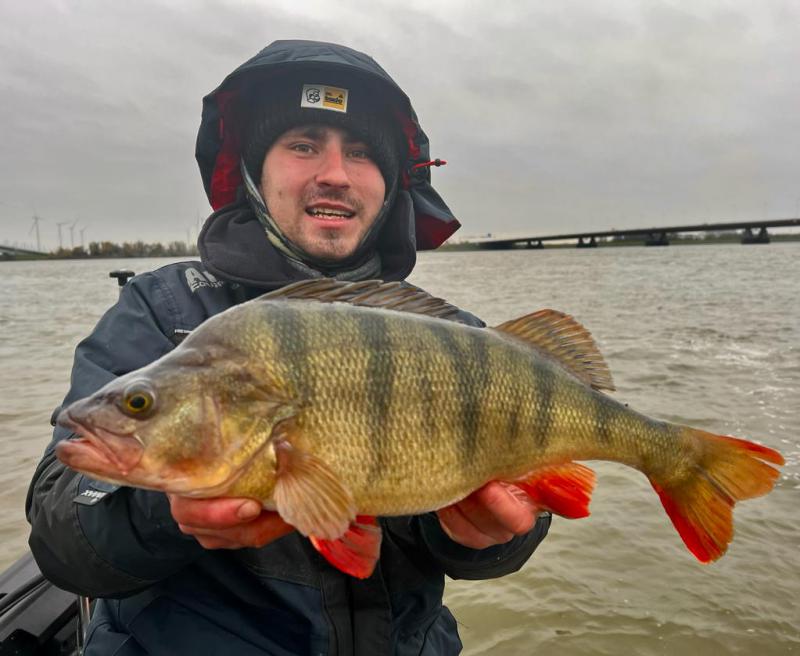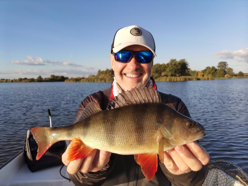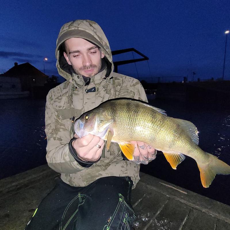 Przez cały praktycznie październik , tak gdzieś do połowy listopada , zaczęły pojawiać mi się w sandaczowych rewirach okonie . O dziwo nie takie większe i zdjęciowe jak to zazwyczaj jesienią późną bywało , ale takie dwudziestki piątki po prostu . Nie za wiele , ale prawie każda wyprawa dawała brania i wyholowane pojedyncze ryby . Często gęsto zmyłka przy braniu była sroga , bo sandacze w tym czasie zaczęły brać na modłę taką okoniową właśnie , wiec nigdy tak naprawdę nie wiedziałem , co wydarzy się po zacięciu . Poniżej ryba z początku października , z okoniowych jeszcze rewirów czterdziesteczka urodziwa . Wzięła w samym korytku na czterocalowego ES w najlepszym pasiakowym kolorze wędzonej przyprawy  ;) . Lekki zestaw sandaczowy i główka 7 gram . Walka ostra i dynamiczna , branie niedaleko łódki , lądowanie takie bassowe bardziej bez użycia podbieraka , bo guma łyknięta w całości .