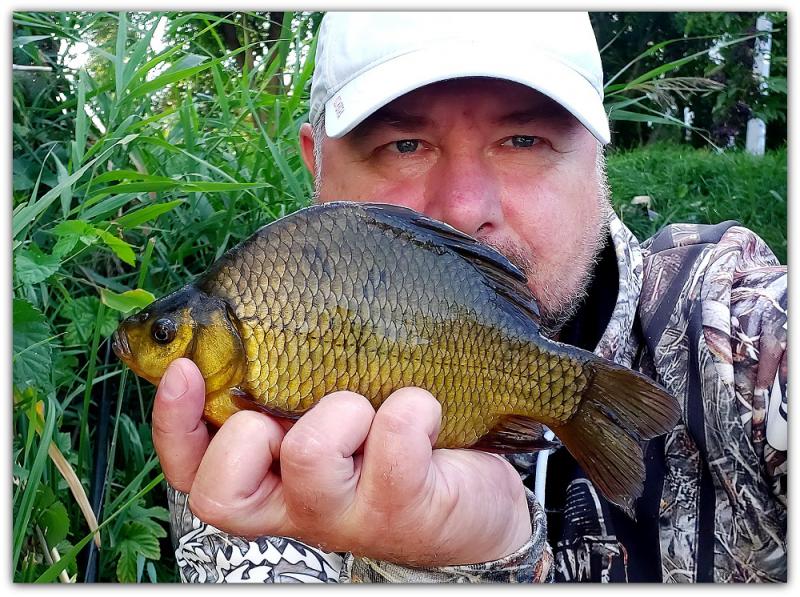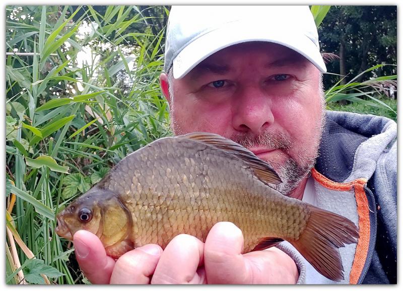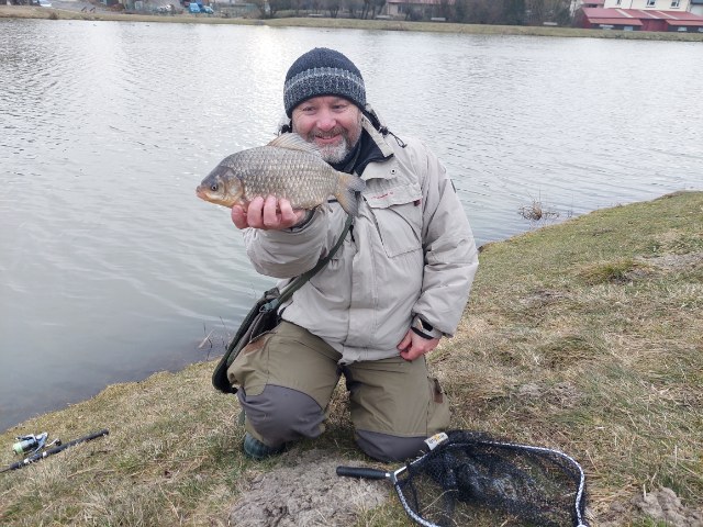 Mnie dzisiaj z rana zelektryzował ememes od Skałki z fotką dużego karasia. Nie moglem tego tak zostawić. Spakowałem muchówkę, pudełko z jeziorowymi muszkami i w drogę. Trochę się obawiałem o rzuty bo moja lewa ręka jest jeszcze dalece niewygojona po operacji. Na miejscu widok zbiornika nie napawał optymizmem - brudna woda. Początkowo było normalnie czyli nic nie brało. Później mini branko i melduje się pierwsza płotka a po niej następne przeplatane okonkami. Aż w końcu czuję takie typowo karasiowe zawiśnięcie ale rybę tracę w holu. Gdy już całkiem straciłem wiarę w złowienie karasia w końcu mam rybę. Ciągnie jakby był karpiem ale po kilku chwilach mam go w podbieraku. Pomiar wskazuje 39cm. czyli całkiem spory karaś. Wypinam muszkę, robię pamiątkowe zdjęcie i uwalniam rybkę. Dzięki Skalka za mobilizację. Postanawiam wracać do domu tym bardziej, że ręka boli coraz bardziej. Niby zwykły karaś ale sprawia, że dzień uznaję za bardzo udany.
