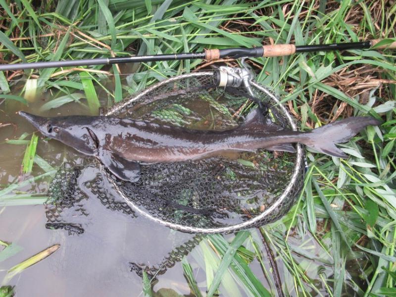 Wczorajsza zdobycz wyjęta na Widelnice Piotrka Matusiaka :). Jesiotr mierzył 97cm, ale był strasznie chudy. Dodam jeszcze tylko, że to nie jedyny przedstawiciel tego gatunku, który mi się wczoraj trafił. Z 10 minut wcześniej przed wyjęciem tego mierzącego 97cm, na kiju miałem trochę mniejszego, ale wyskoczył nad tafle wody, zrobił "świecę" i się niestety spiął. Poza tym miałem jeszcze dwa brania. Wszystko na Widelnice prowadzoną niemal jak na "przepływankę", rzucając gumkę w środek rzeki, pod prąd i ściągając ją z nurtem zwijając jedynie luz na plecionce, delikatnie co chwile podszarpując szczytówką. To trzeci jesiotr, którego udało mi się wyjąć w przeciągu roku z tego samego miejsca na Warcie na spinning.