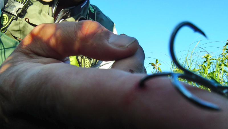 Niestety chwilę przed tym zdjęciem ma miejsce mały wypadek, otóż ryba wypięta swobodnie pływa w dużym podbieraku, a wobek za jeden grot zaczepiony za duże oczko gumowanego podbieraka - prosta sprawa wypiąć, niestety gdy sięgam do kotwicy, boleń który jest w świetnej formie, uderza na tyle mocno w siatkę podbieraka, że kończy się kotwicą w palcu.