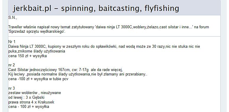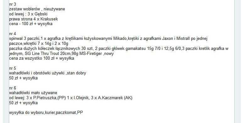 SlawekNikt Opublikowano 11 Czerwca 2022 Zgłoś Udostępnij Opublikowano 11 Czerwca 2022 Kilka dni się zastanawiałem czy w ogóle pisać o tym byle jakim zachowaniu użytkownika @Traveller bo absolutnie nic na tym nie zyskam, a na pewno ponownie wiele stracę w oczach innych kumpli, tych solidnych użytkowników jerkbait.pl. Jednakże w końcu uznałem, że warto abyście i Wy wiedzieli jak "kolega" Traveller podchodzi do spraw giełdy. Nie myślałem, że rozsądny jak mi się wydawało użytkownik @Traveller (klikamy także na innym forum) będzie się wymigiwał od sprzedaży po cichuteńku czyli usuwając ogłoszenie i nie odpowiadając na wiadomość. Tak, wiem. Nie miał absolutnie żadnego obowiązku sprzedawać mi czegokolwiek. Zdaję sobie też sprawę, że jestem dość kontrowersyjną osobą głównie za sprawą ostatniego mocno nagłośnionego przypadku podczas zakupu. Tu dziękuję moderacji za to bo jednak uważam, że warto byłoby aby sprzęt jaki się na tutejszej giełdzie pojawia był opisany zgodnie ze stanem rzeczywistym. Wróćmy do meritum. Wystarczyło po prostu napisać wiadomość do mnie o rezygnacji ze sprzedaży i po temacie, a nie myśleć ponad 2 dni i kombinować jakby tu uniknąć sprzedaży i aby z tego z przypału "wyjść z twarzą" ... Ale od początku. Otóż kilka dni temu @Traveller zamieścił ogłoszenie o sprzedaży kilku rzeczy. Zadeklarowałem zakup woblerów z pozycji trzeciej. Po dwóch dniach milczenia ze strony sprzedawcy czyli @Traveller napisałem wiadomość z pytaniem czy kupiłem te woblery czy też nie. W tzw. międzyczasie ogłoszenie zostało przez @Traveller usunięte i już wiedziałem, że odpowiedź będzie tylko jedna. Wiadomo, nie sprzeda mi tych woblerów. Nic to ... Były te, będą i następne. Koniec. Odnośnik do komentarza Udostępnij na innych stronach Więcej opcji udostępniania...