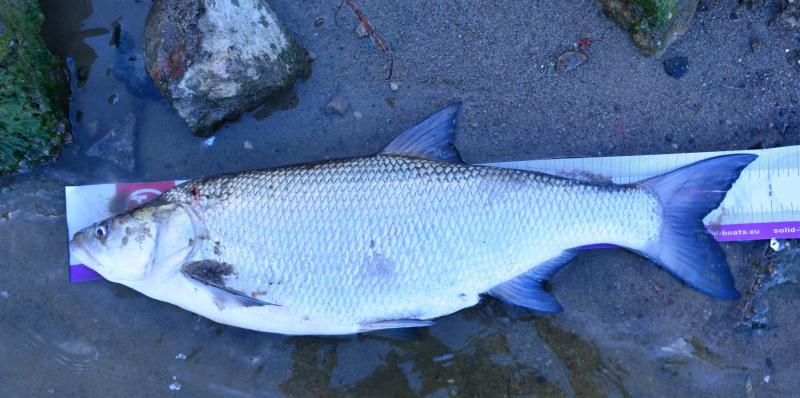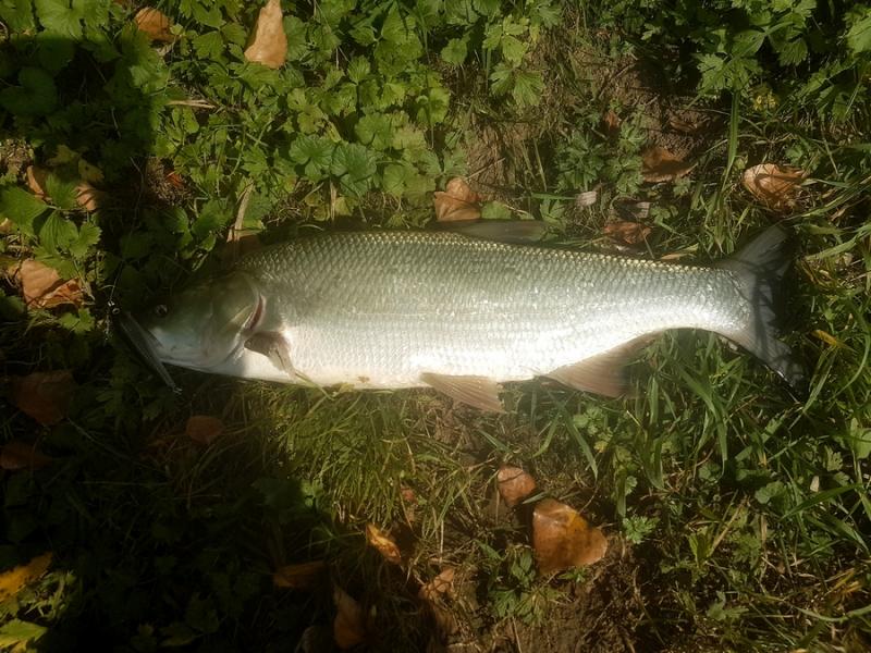 W związku z tym, co działo się w nocy w pogodzie, postanowiłem zacząć od kleni - i to był strzał w "dychę" - już pierwsze minuty dały ładnego klenia, którego sobie tylko znanym sposobem zrzuciłem z kotwicy podbierakiem...