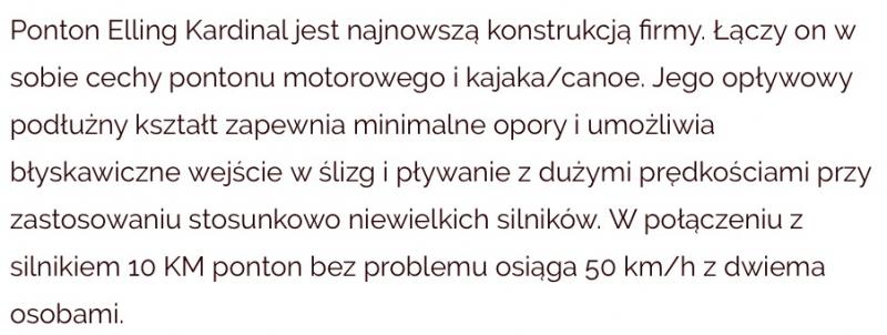 ''Ponton Elling Kardinal jest najnowszą konstrukcją firmy. Łączy on w sobie cechy pontonu motorowego i kajaka/canoe. Jego opływowy podłużny kształt zapewnia minimalne opory i umożliwia błyskawiczne wejście w ślizg i pływanie z dużymi prędkościami przy zastosowaniu stosunkowo niewielkich silników. Zapraszamy na www.elling-polska.pl''