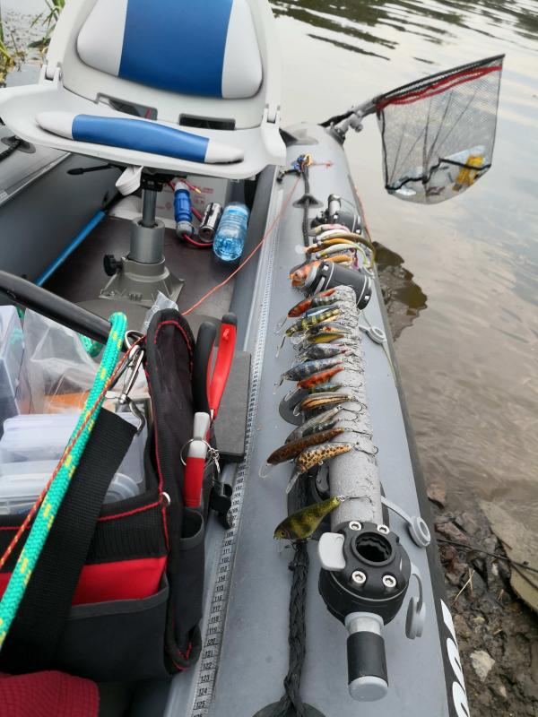Jest dość wolny na wiosłach i trudno utrzymać kierunek płynięcia, ale to chyba też kwestia wprawy. Muszę go doposażyć w parę drobiazgów - inne uchwyty do wędek, coś do mocowania kotwicy, uchwyt do echa  (Deeper).
