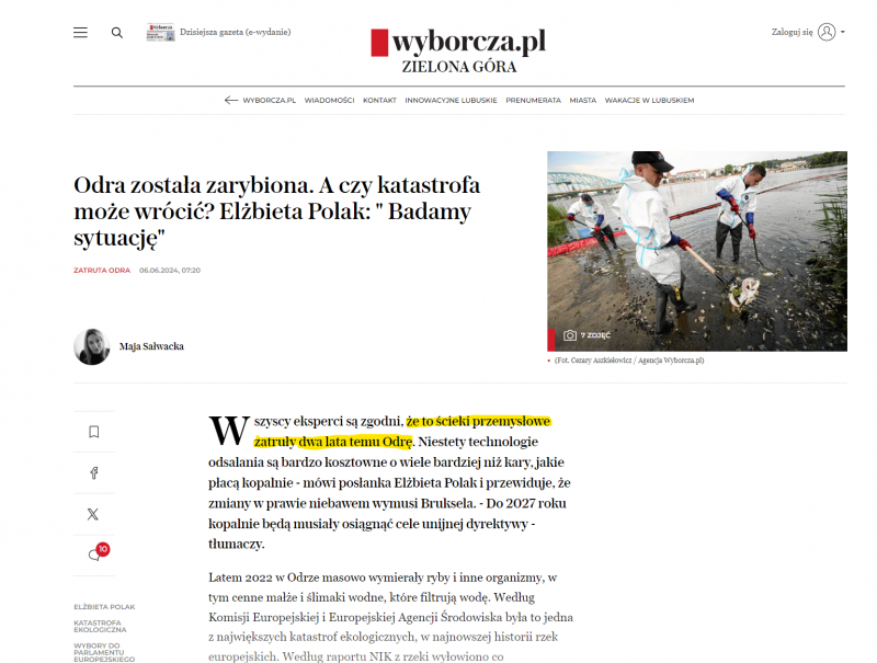 DelTor0 Opublikowano 16 Czerwca 2024 Zgłoś Udostępnij Opublikowano 16 Czerwca 2024 Ani sól ani algi nie są przyczyną śnieć ryb w Odrze. Przyczyny są dwie, pierwsza to biogeny druga to toksyczne ścieki. Sól i algi to bajki dla dorosłych, wyświetlane w TV jak dobranocki dla dzieci. U nas przeszlo pewnie bez echa, ale Niemcy jakis czas temu w swojej prasie pisali, ze glowna przyczyna wlasnie byl zrzut sciekow po stronie niemieckiej. Nie zadne sole czy algi. Mozna sobie poszukac, artykul w Märkische Oderzeitung. Edit, a zeby zamknac cala dyskusje to prosze (zrodlo koszerna, zeby nie bylo ze jakies teorie spiskowe ) Art 6/6/2024 1 Cytuj Odnośnik do komentarza Udostępnij na innych stronach Więcej opcji udostępniania...