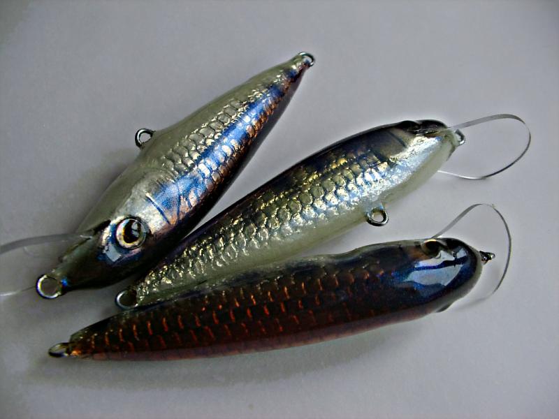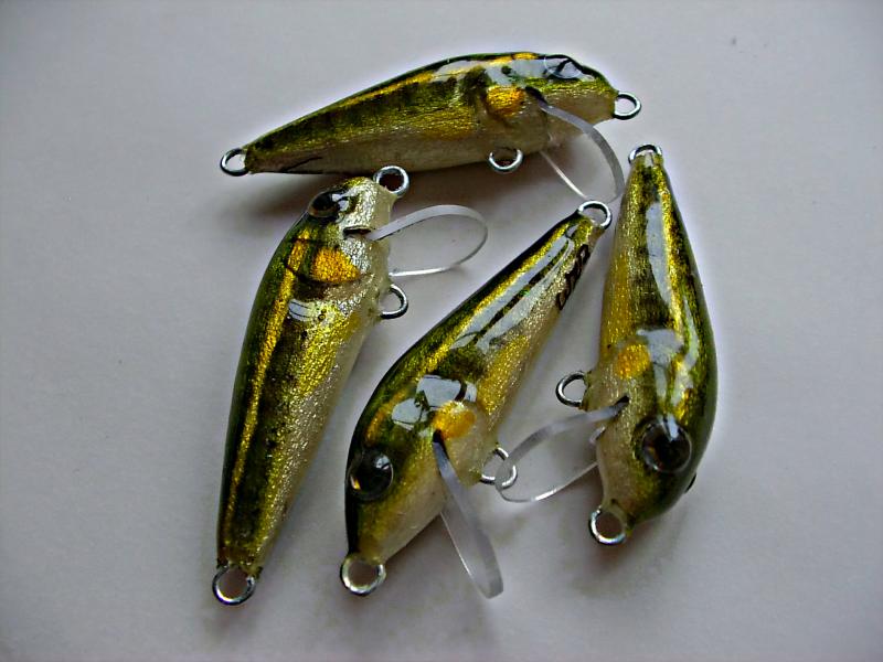 Otrzymałem wcześniej "na wzory" kilka woblerów do twitchingu. Po doświadczeniach z Warty przyjrzałem się im dokładnie, przeanalizowałem rozkład obciążenia, budowę, zachowanie w wodzie i wykonałem pierwsze trzy egzemplarze. Moje korekty okazały się trochę przesadzone, musiałem jeszcze zmniejszyć ster w porównanie z i tak małym oryginałem :) Pomimo to nadal pracują dość żwawo. Najważniejszy jednak jest moment, gdy przynęta szarpnięta ustawia się bokiem do kierunku płynięcia. Mam wrażenie, że czasami nawet zawraca... Trudne warunki (słaba przeźroczystość wody) utrudnia testy, które (może) wreszcie będę mógł w pełni prawidłowo przeprowadzić, w najbliższym czasie, na Dziećkowicach. Dwa woblery pojechały na Puchar Sanu, ale do wody nie trafiły, gdyż nie były wcześniej należycie obłowione. Może szkoda, bo na jeden z nich, w czasie testów, uderzył pstrąg. Był chyba jeszcze bardziej zaskoczony od Łukasza, gdyż zanim założył tego woblera, w tym samym miejscu testowaliśmy kilkanaście innych, bardziej lub mniej tradycyjnych przynęt.