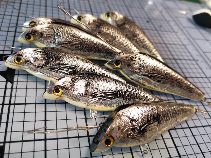 Będzie też garstka naturalnych. Te były kilka lat temu wykańczanie folią pozłotniczą. Dziś niestety okazało się, że z ponad 20 Whiplashy mikro nadaje się siedem :(. Wobler jest odlewany w 3 cyklach, jeden musiałem pominąć i 13 szt poszło w kosz. Odlewam ponownie, może się wyrobię "na styk" te się definitywnie nie nadają, bo bez tego jednego elementu to już inny wobler. 5 kropel żywicy... :(