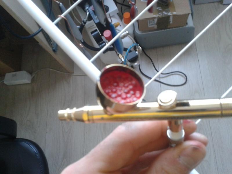 Jeżeli zdarzy się jakieś przyschnięcie przy malowaniu, gdy masz farbkę w zbiorniczku, można zrobić cofkę przez zatkanie palcem dyszy i naciśnięcie spustu wraz z  jego odciągnięciem. Powstaną wtedy w zbiorniczku pęcherzyki powietrza.