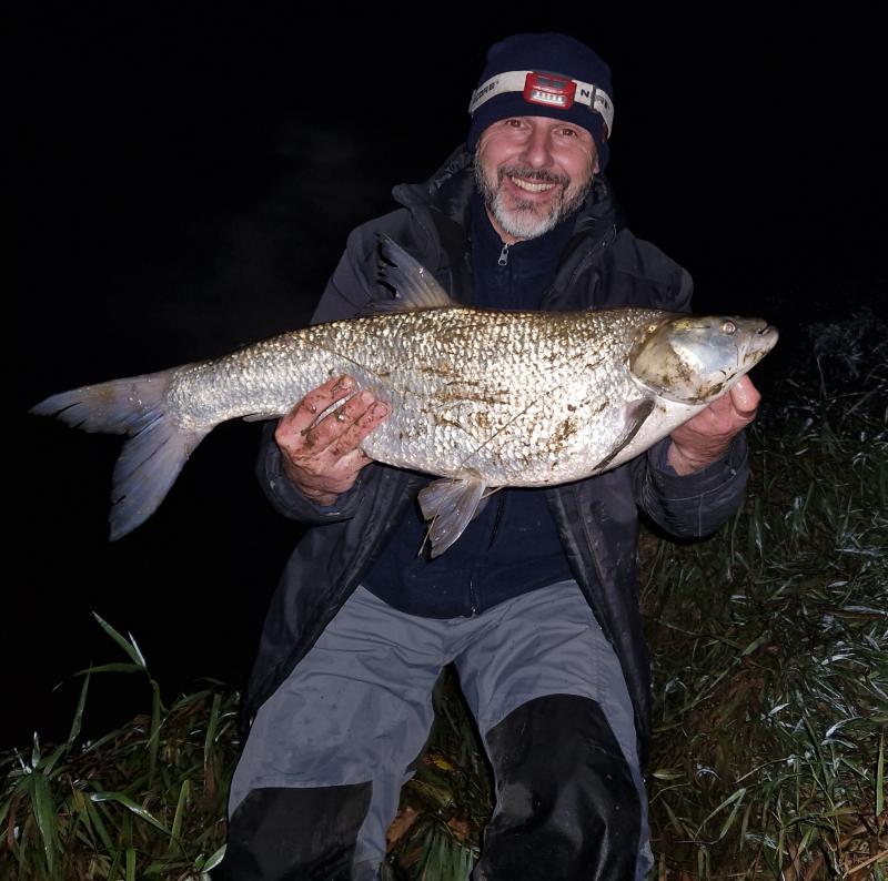 Ostatnio trafiłem kilka boleni ale ten z wczoraj miał największy brzuchal  :) błoto na brzegach takie że można zjechać do wody jak Małysz, na chwilę odłożyłem rybę w podbieraku na trawę i cała ubłocona a jeszcze robić sobie zdjęcie samemu w takich warunkach to jest  :angry: