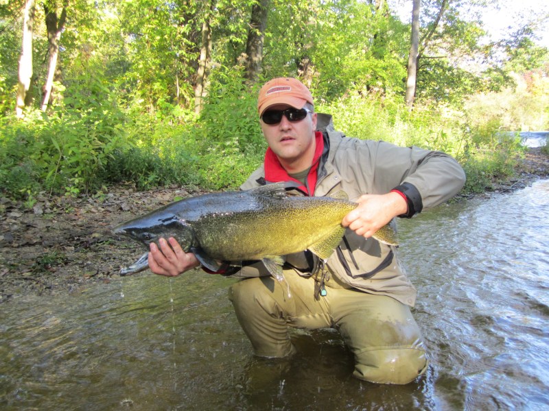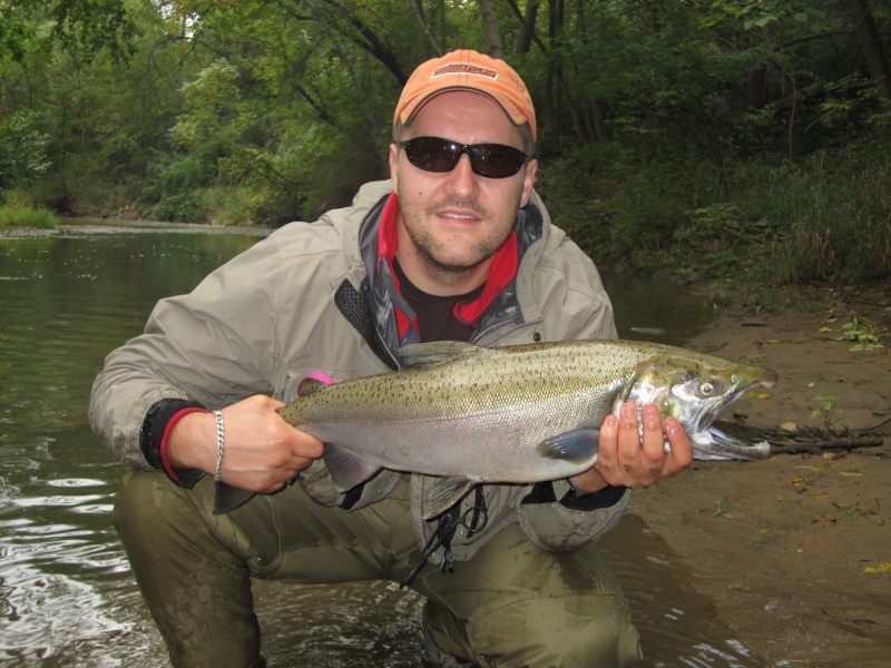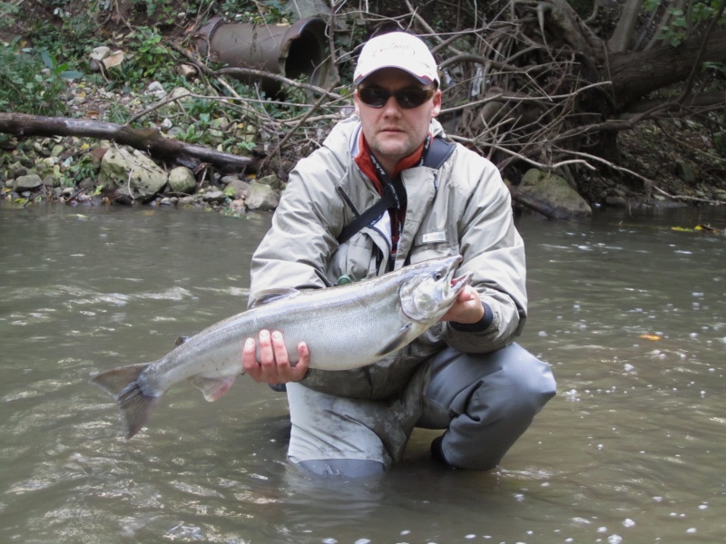 Dokladnie rok temu u boku sp Tropiciela i Archiego stawialem pierwsze muchowe kroki. Pamietam dzien kiedy Tadek zlowil okolo 20 lososi a ja jednego malego basa hehe. Ale ile znaczy uczyc sie od najlepszych. W tym roku Tadek towarzyszyl mi duchem. Pierwszego dnia zlowilem okolo 7 na 20, drugiego tylko 2 na 5 ale lowilem tylko 1,5h, trzciego mialem okolo 30 morderczych holi i wyciagnietych 11 lososi w tym jeden metrowy i jeden srebrny coho. Muchy, ktorych uzywam to glownie glo bugi (szybko i tanio sie kreci) i ESL. Mam tez pudeleczko z nimfkami ale na nie jeszcze przyjdzie czas.