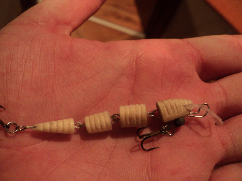 wepster Opublikowano 13 Lutego 2013 Autor Zgłoś Udostępnij Opublikowano 13 Lutego 2013 (edytowane) Nagrałem pracę kilku woblerków. Jakość kiepska ale jest...Znalazłem w szufladzie zapomniany przeze mnie korpus. Pomalowałem go tak na szybko bez pomysłu i od niechcenia i myślę, że nawet nie najgorzej wyszedł. Lakier rozmył tylko nieco czerwone kreski na ogonie, które miały imitować rany po ząbkach szczupa.... Wobek ma 7,5 cm, pracuje agresywnie i myślę że będzie schodził na niezłą głębokość. Może jakiś zębol go dziabnie A tu jego praca: Raczki. Każdy z nich pracuje nieco inaczej gdyż mają stery pod różnym kątem (eksperymenty ) W przyszłości postaram się zrobić cięższe, tonące.... TYlko gdzie ja ten ołów pomieszczę?! Hmmm.. Duży raczek Edytowane 13 Lutego 2013 przez wepster Cytuj Odnośnik do komentarza Udostępnij na innych stronach Więcej opcji udostępniania...