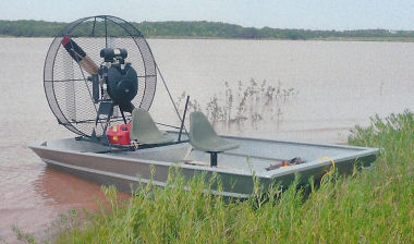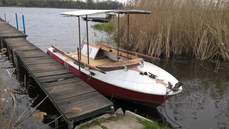 Stara milicyjna motorówka. Sporo przeróbek chałupniczych, ale każda zdaje egzamin. Dwa odpływy wody - jeden z przodu, jeden na rufie. Żadnego wybierania wody. 100% płaskiej podłogi. Do pływania wstawiamy dwa fotele karpiowe, bo wygoda to podstawa. Spora dziobowa bakista. Na ten sezon daszek został zdjęty, bo skoro dorocha jest zakazana, to wygodniej operuje się bez daszku. Można sterować sterem lub silnikiem, w zależności od potrzeb, warunków i inwencji.