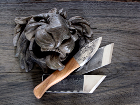 zahar Opublikowano 31 Marca 2013 Zgłoś Udostępnij Opublikowano 31 Marca 2013 Lubię prowadzić nóż a nie, gdy on mnie prowadzi, dlatego wszelkie z łamaną klingą są dla mnie za wiotkie, ale to mój wybór i przyzwyczajenie i chociaż w tych czasach to archaizm, ale zrób go sam, najtańszy i najlepszy (nie licząc własnej pracy, lecz to przyjemność). Z brzeszczota (maszynowego) piły ramowej do metalu. Jest ze stali szybkotnącej, i tnie wszystko. Od znajomego ślusarza za darmo, gdy jest pęknięty jest dla niego bezużyteczny, a jest dobrym surowcem na wszelkie noże. Jeżeli w klocku będzie mały gwoździk, przy zamaszystym cieciu, możesz go nie poczuć. Używałem takie do twardych egzotyków, afrykańskie drewienka zawierają dużo krzemionki i potrafią szybko tępić narzędzia, bardziej niż czarny dąb, a jak nie mam innego narzędzia pod ręką, fazuję takim nożem wywiercony otwór w stali. Kształt zależny od potrzeby i fantazji, pomimo, że jest kruchy trudno go zniszczyć. Wolno się tępi, wiec mogą być problemy z zatrzymywaniem na kciuku. Szybkie wyprowadzanie na dobrym papierze 320, na starym miejscu można ostrze zapolerować, więc nie celowe jest używanie wyższych numeracji, na marmurku (na mokro) będzie jak brzytwa. Polerowanie ostrza na filcu, też nie jest celowe, ponieważ je wyobla i zmienia jego kąt, ostrze traci „jad”. Nóż nie musi być ładny, lecz skuteczny, aby nie drażnić mnie lub materiału. Kształt zależny od potrzeby i fantazji. Do balsy, lipy i innych miękkich drewienek zostanie wnukom. Na obrazku bardzo podstawowe, jeden osadzony w jatobie, z dłubaniną w czarnym dębie, ale to trochę inna bajka niż woblery, jeden nożyk może nie wystarczyć. Cytuj Odnośnik do komentarza Udostępnij na innych stronach Więcej opcji udostępniania...
