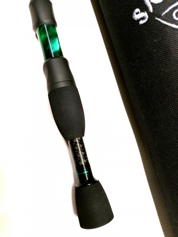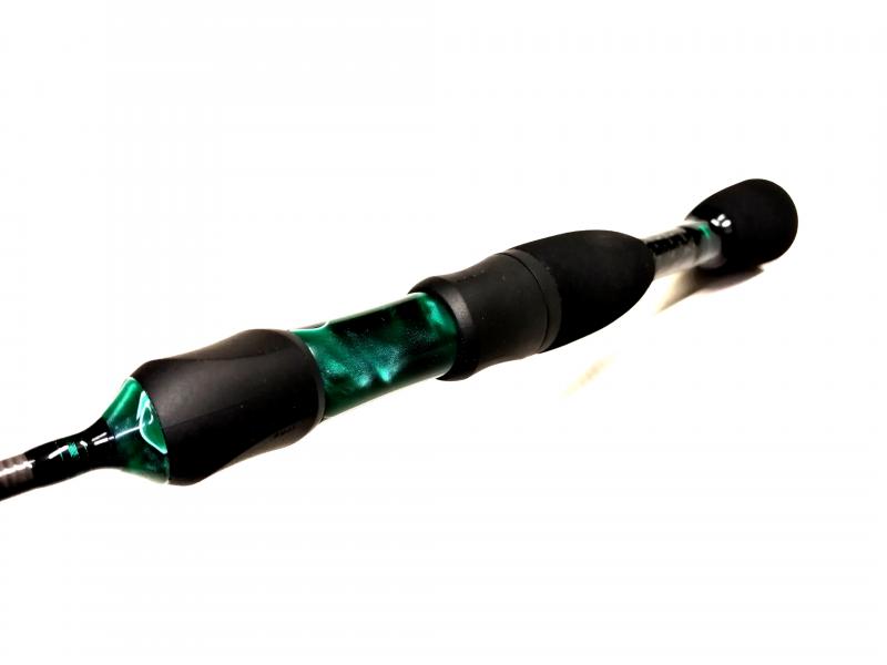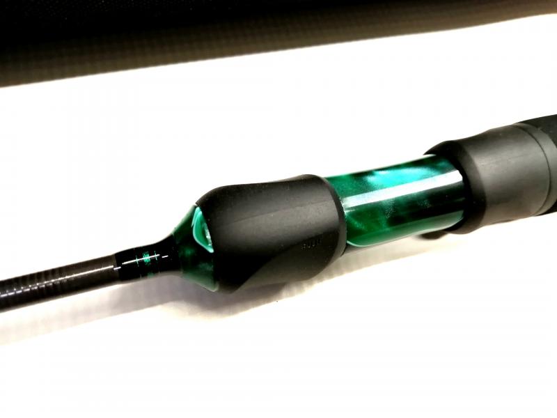 Kijek ten dostał dość nietypową , bardzo krótką rękojeść.  Uchwyt Fuji KSKSS 16, insert i pierścień dotaczany z akrylu kolorku turkusowego, nakrętka zabudowana pianka Matagi, zakończenie również. Przelotki najlżejsze z możliwych Fuji Torzite T2.