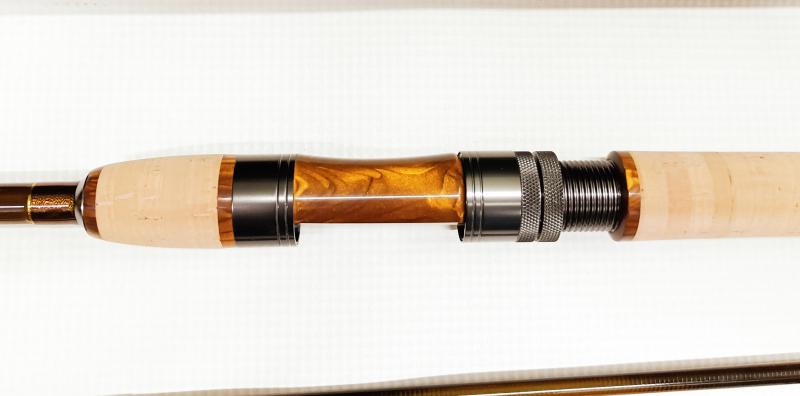Kijek na pełnej rękojeści z naturalnego korka , wykończenia z drewna stabilizowanego, Uchwyt Fuji DPS 17 GM + insert z drewienka, przelotki Fuji Torzite T2.