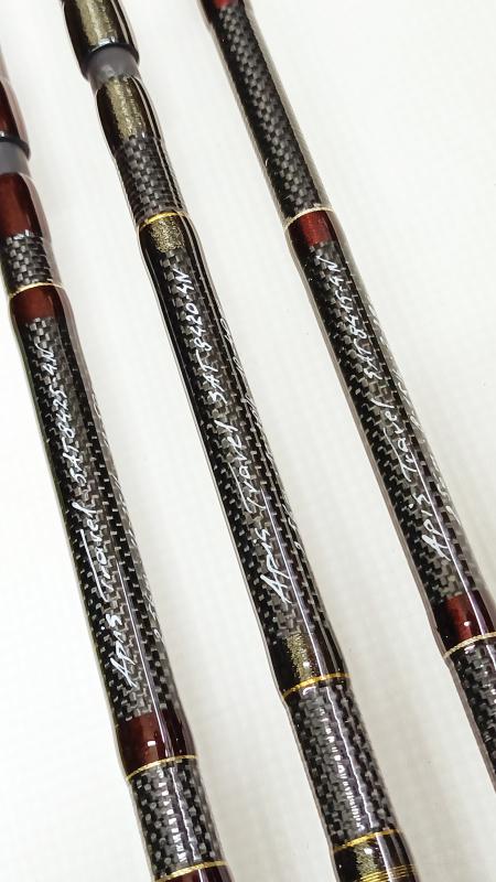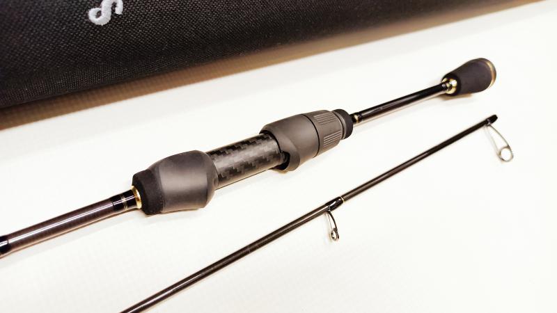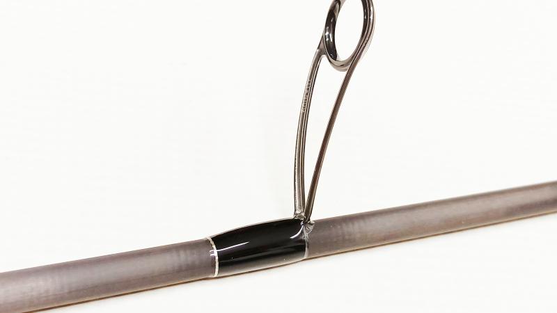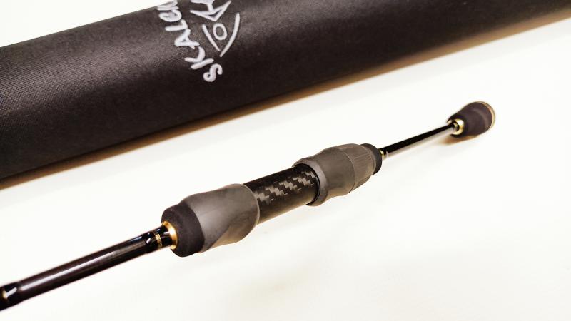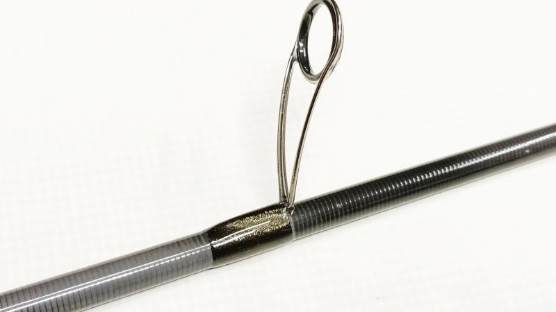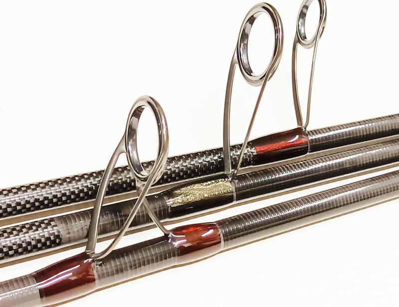 Egzemplarz ten dostał dzieloną rękojeść z carbonu i pianki Matagi. Uchwyt carbonowy AT Apex CCT ulh z nakrętką zabudowaną carbonem, przelotki Fuji Torzite T2.