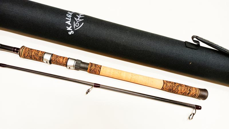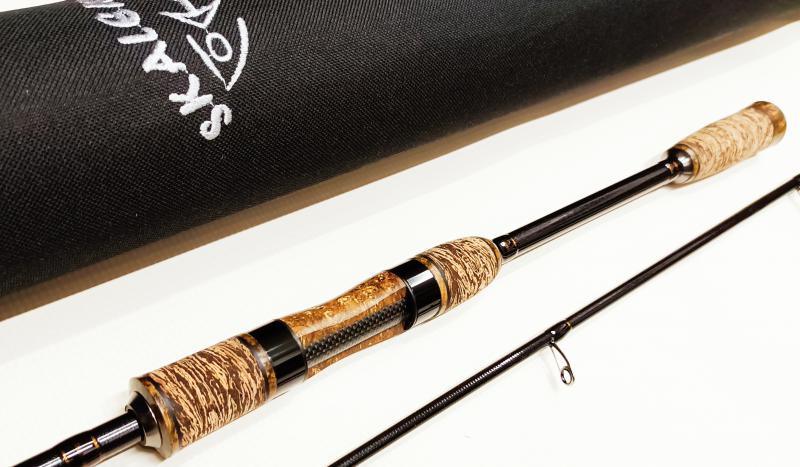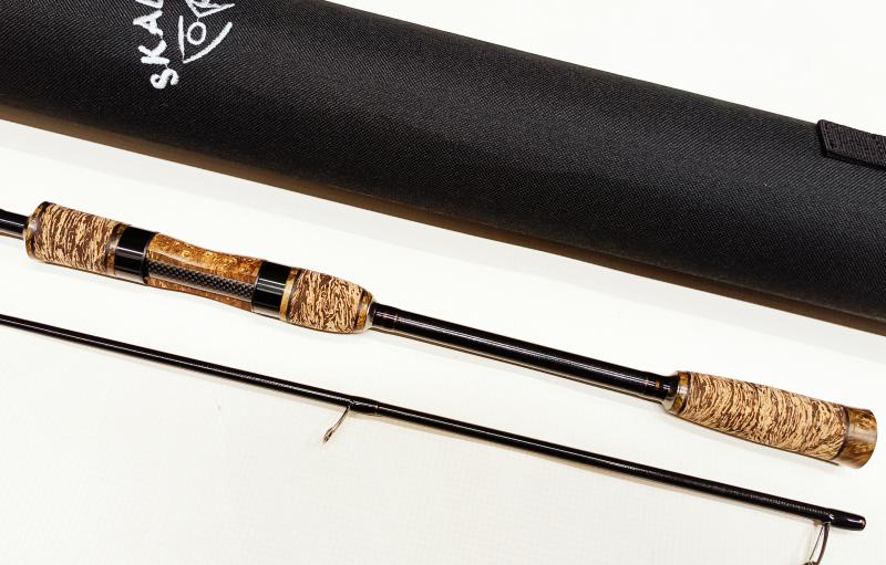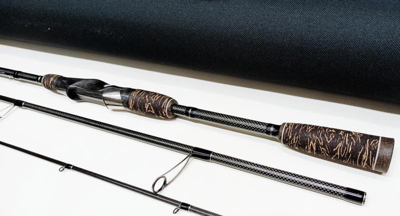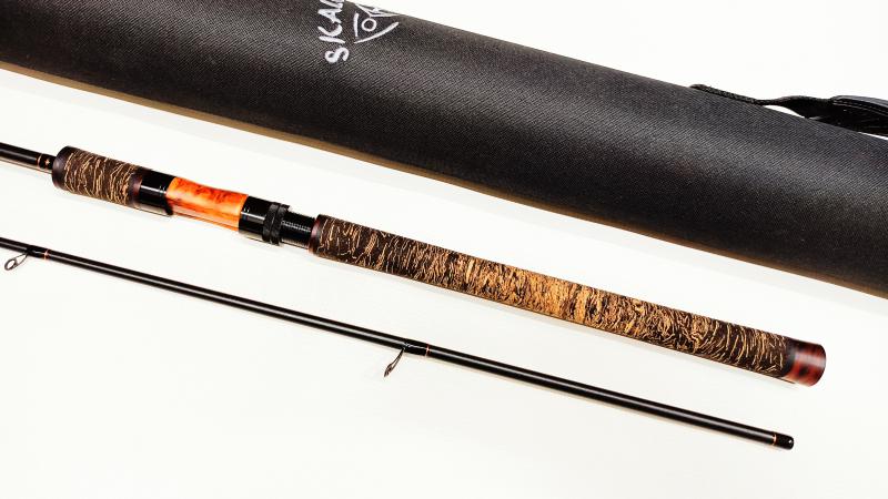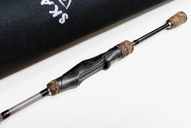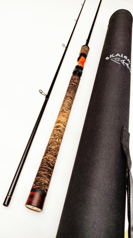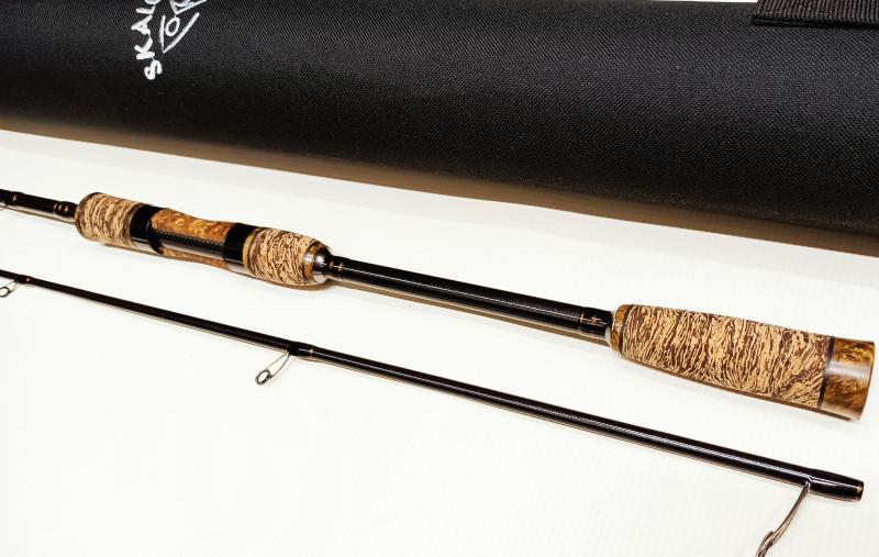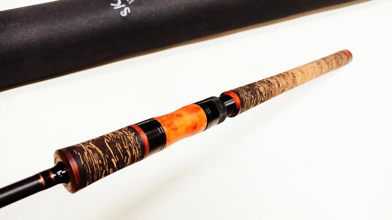 Rękojeść pełna z naturalnego korka portugalskiego fajnej jakości, wstawki z drewna stabilizowanego, uchwyt Fuji DPS 16 z insertem drewnianym, przelotki Fuji Torzite. Czyli klasycznie ze smaczkiem. ;)