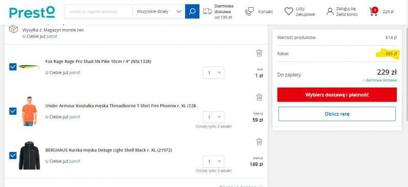 godski Opublikowano 29 Kwietnia 2021 Zgłoś Udostępnij Opublikowano 29 Kwietnia 2021 Niezłe ceny na gumy: https://lp.morele.ne...Przynęty gumowe Zresztą w PRESTO czasem można trafić tani towar Dziwna sprawa. Widnieje na głównej stronie cena np. 1 zł a jak wchodzisz w towar to 4. To samo z kurtkami. 199 a głębiej 400. Cytuj Odnośnik do komentarza Udostępnij na innych stronach Więcej opcji udostępniania...