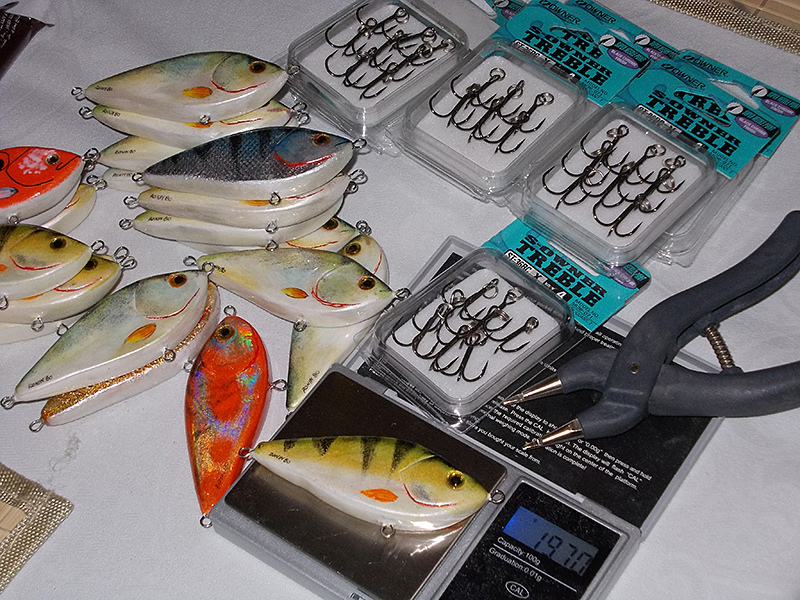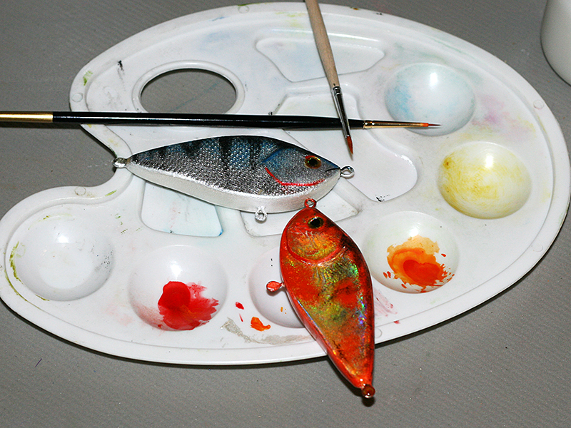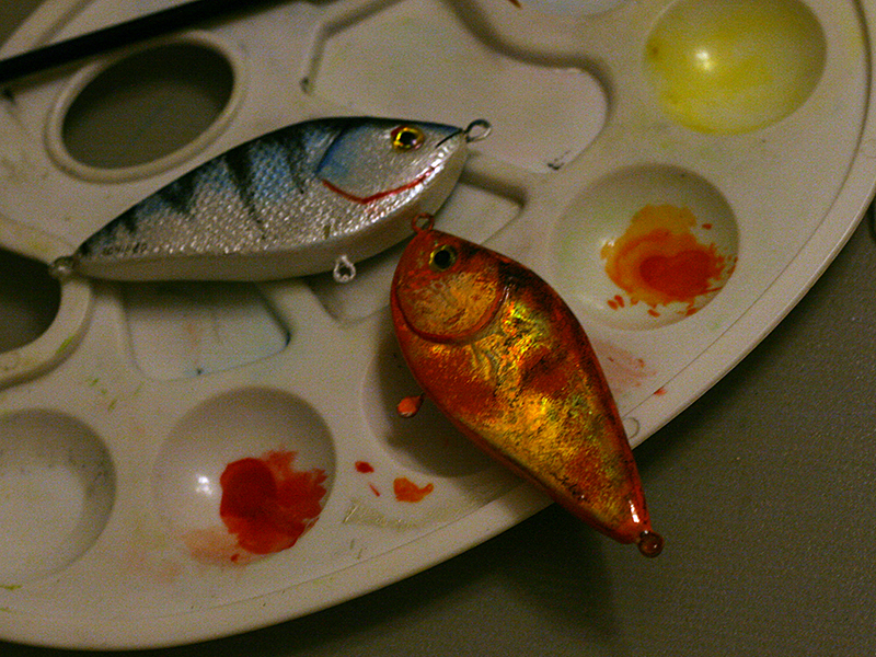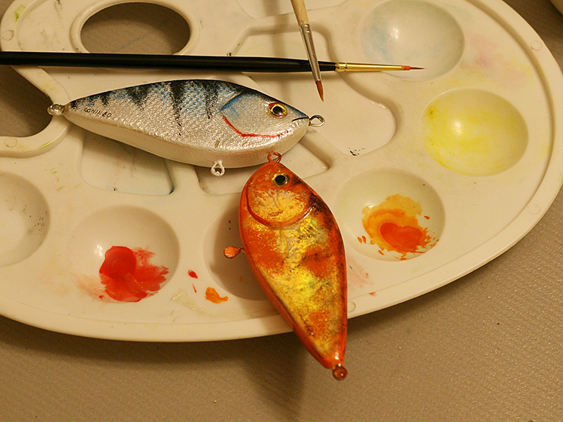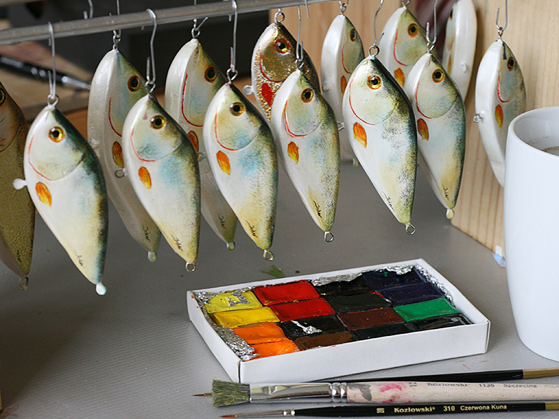 Płoteczki już po malowane, jakieś pojedynki karasi w folii i kilka okonków również na ukończeniu. Jeszcze kilka warstw lakieru, kontrola pływalności i pojadą w świat