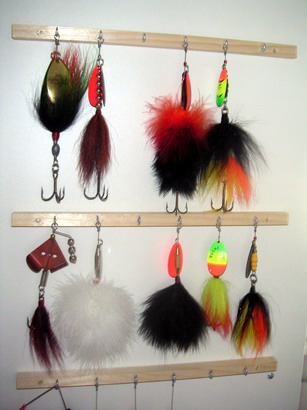 niejako, ze ja lubie szybko znalesc, to czego szukam, wiec staram sie miec nie tylko porzadek ale takze system, dlatego tez przetrzymuje przynety nie tylko w pudlach (woblery, jerki, gumy), ale takze na 'wieszakach' - sa to z reguly wieksze obrotowki i wahadla;
