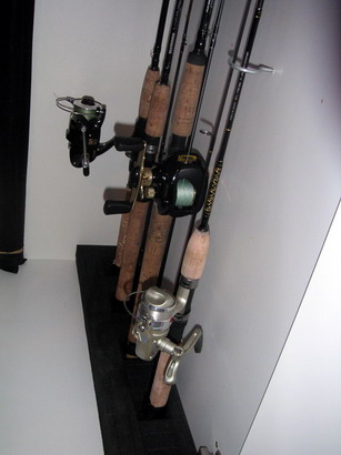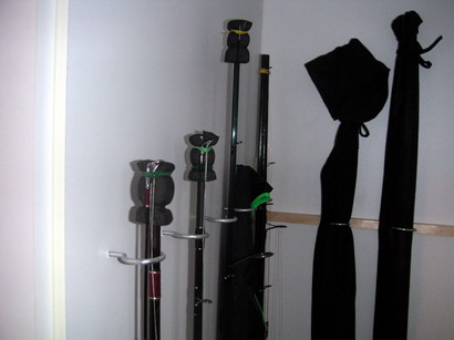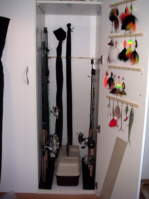 wedki stoja sobie wzdluz scianek szafy, oparte, w przegrodkach, dolnikami o twarda gabke i zahaczone o duze haki, ktore wkrecilem w scianki szafy;