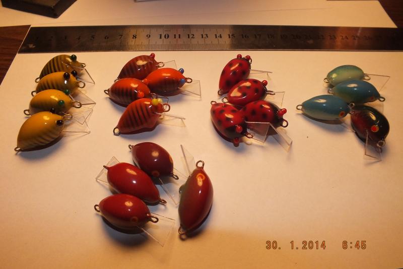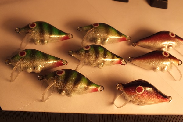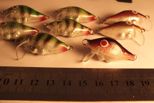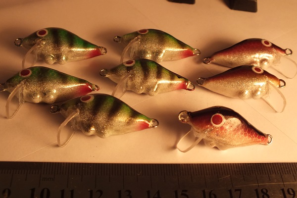 Kolejna odsłona smużaków w moim wykonaniu. Wszystkie wykonane z balsy, stelaż w jednym kawałku, długość  2,5/3,0 cm, waga 2,9/3,1 gr. Różnią się od siebie odrobinę budową i umiejscowieniem steru, w celu wybrania najlepszej konstrukcji  do powielania na najbliższy sezon. Praca od drobnego do mocnego „X”. Zastanawiam się jeszcze nad wklejeniem odnóży do owadopodobnych  wobków ?  Trochę popsułem efekt wizualny przez użycie końcówki starego lakieru i na niektórych powstały bąble.