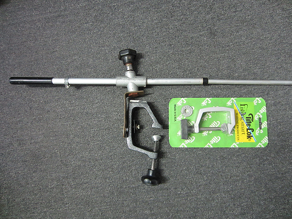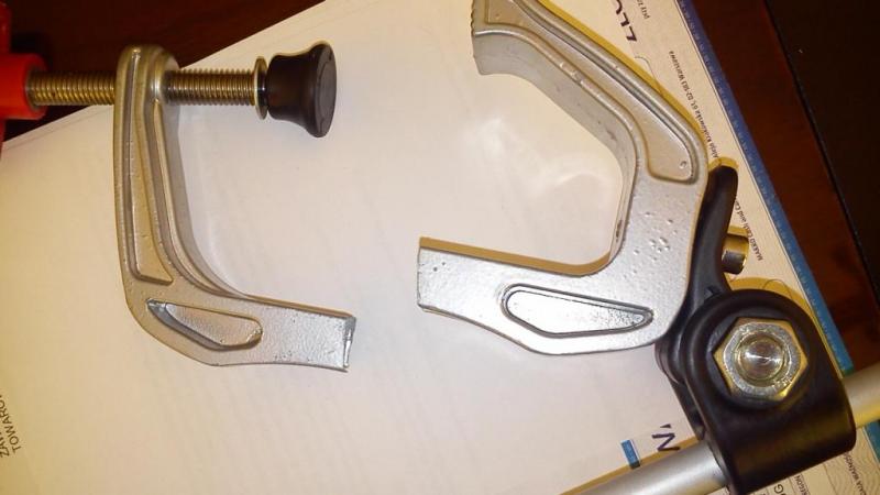 Obok lezy imadelko Title looka..jako przestroga dla ewentualnych konstruktorow  - ksztalt nie nadaje sie do zamocowania na burcie, sruby nie wykorzystamy w "naszych" imadlach z uwagi na gwint calowy..za to koncowka po rozgieciu i zalozeniu na "nasz" uchwyt zapewni pewne trzymanie...
