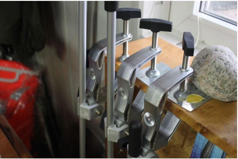 Nastepne 2 zdjecia w syt. mniej komfortowej, gdy burta/ pawez jest za szeroka dla imadla ale jest dostepny kolnierz w/w burty. Wowczas trzeba odkrecic szczeki uchwytu, tak aby wyjac rurke i obocic ja o 180 st, zakrecic szzceki i niestety zakrecac "od strony wody". Jednakze (o ile uda sie nam to zrobic) trud sie oplaci bo nadal mozemy podniec uchwyt 1 ruchem.