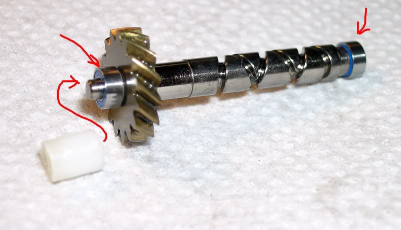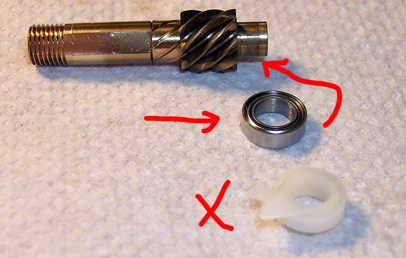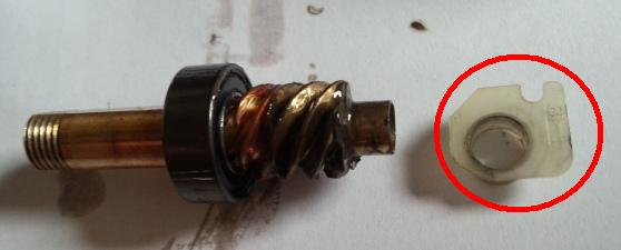 Powinieneś przycięty teflonowy "korek" oddzielić podkładką, tzn zewnętrzny pierścień łożyska, on jest stały a wewnętrzny się kręci z wormem.