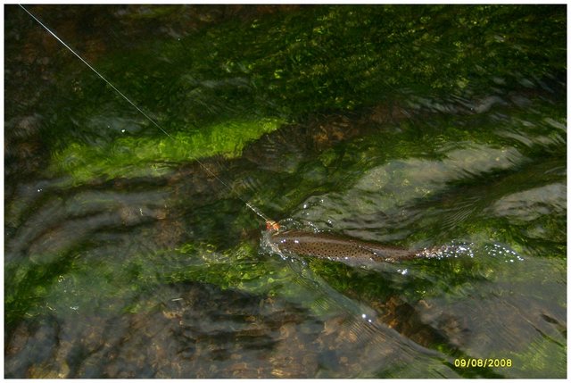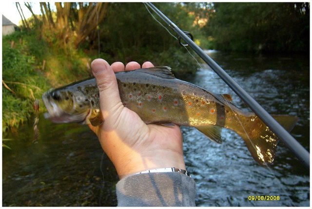Nie mial czerwonych kropek, same czarne. W Szkocji takie niespodzianki nie trafiaja mi sie tak czesto jak w Polsce. Kilka lat temu na Slupi we wrzesniu w ciagu jednego dnia mialem przeszlo 10 pstrazkow takich trzydziestakow i mniejszych na obrotowki nr 5. Kotwiczki ledwo miescily im sie do pyska. Najlepsze jest, to ze niektore walily do skutku, az sie zapiely. Dziwne sa te ryby.
