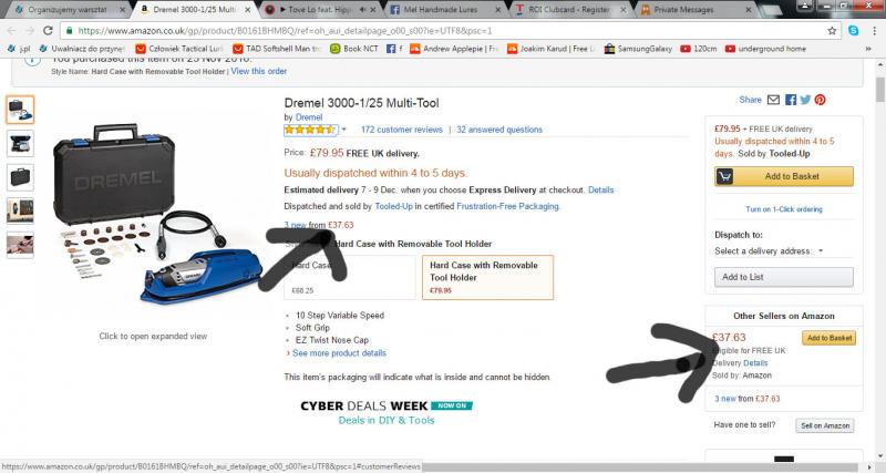 Melanzyk Opublikowano 30 Listopada 2016 Zgłoś Udostępnij Opublikowano 30 Listopada 2016 Ja właśnie zakupiłem kolejnego Dremela z tego linku - https://www.amazon.co.uk/gp/product/B0161BHMBQ/ref=oh_aui_detailpage_o00_s00?ie=UTF8&psc=1W opcjach zakupu jest możliwość kupienia bezpośrednio od Amazona i wtedy cena jest ciekawa (£37.63). Załapałem się także na Free delivery więc jak najbardziej jestem zadowolony z zakupu. Wczoraj przyszedł PozdrM 1 Cytuj Odnośnik do komentarza Udostępnij na innych stronach Więcej opcji udostępniania...