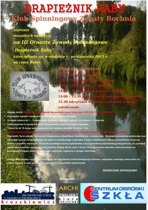 obcy91 Opublikowano 25 Września 2013 Zgłoś Udostępnij Opublikowano 25 Września 2013 (edytowane) Witam, Klub Spinningowy Zębaty Bochnia zaprasza na kolejną edycję zawodów spinningowych na pięknej,malowniczej rzece Rabie.Szczegóły zawodów widoczne na załączonym plakacie.Zapraszamy również do odwiedzenia naszej strony www.zebaty.com .Dane: 50.056257,20.467086 Edytowane 25 Września 2013 przez obcy91 Cytuj Odnośnik do komentarza Udostępnij na innych stronach Więcej opcji udostępniania...