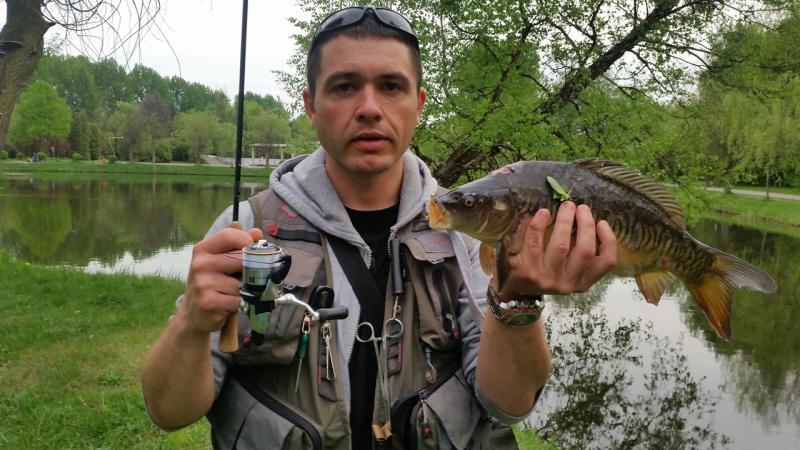 Wreszcie znalazłem troszkę czasu i w zeszłym tygodniu wybrałem się na grube wzdręgi i karpie. W pierwszym dniu niestety nie mogłem sobie poradzić, wzdręgi słusznych rozmiarów standardowo wyjeżdżały, ale karpie rwały mi łączenie pletki z żyłką, więc przestałem je łowić w tym dniu i skupiłem się na wzdręgach. Na następny dzień odpuściłem wszystkie obowiązki zawodowe jak i rodzinne i z samego rana zameldowałem się na wodzie. Zmieniłem tylko Varivasa na żyłkę 0,10mm. Już w kilku pierwszych rzutach wypiąłem karpia takiego ok. 3kg., później zająłem się grubymi wzdręgami, po czym ustał wiatr i znowu zabrałem się za karpie. Zauważyłem, że w tym roku lepiej reagują na żółto-zielone jigi i takie też przygotowałem sobie, specjalnie pod tą wodę. Długo nie musiałem czekać na pierwsze brania, wyholowałem 4 karpie w przedziale 33-43cm. Sprzęt bez zmian, tylko tak jak pisałem powyżej zmieniłem pletkę na dobrej jakości żyłkę. Na fotce największy zawodnik ze złowionych. Pod koniec tygodnia jeszcze je troszkę pomęczę i biorę się za karachy i liny ;).