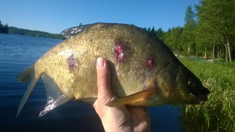20 minut bez wiatru na jeziorze i trafił się taki "liszaj wąchacz'' zakolczykowany za nos :D .Rany najprawdopodobnie po ''szczupłym'' lub po sieciach i do tego z jakąś infekcją.Pomimo tego rybka w doskonałej kondycji,oczywiście jak na leszcza.