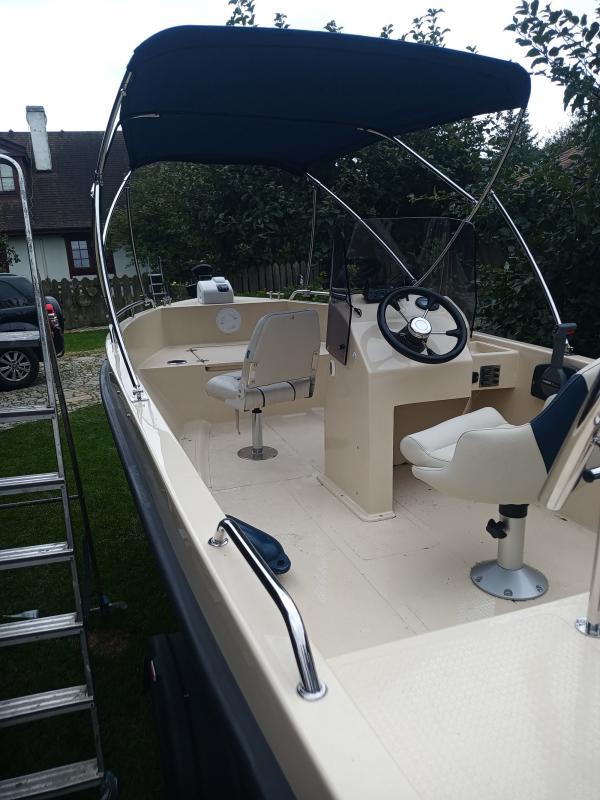 3. Wigry 434 od Eurołodzie- jedyna jednostka która pływałem... piękna... sterówka z pionowym relingiem ułatwiającym przechodzenie i wstawanie z fotela- mistrzostwo świata, miejsce sternika jak w przysłowiowej "S klasie", na 25KM pływa wspaniale, stabilna z całkiem dużym pokładem i długą bakista w której schowamy pagaj i lampę topowa...