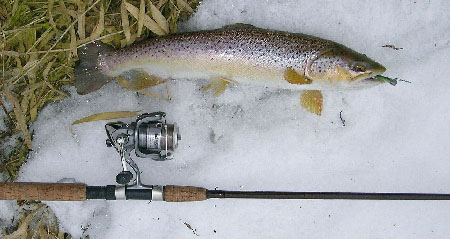 0 popper Opublikowano 21 Marca 2006 Zgłoś Udostępnij Opublikowano 21 Marca 2006 Otwarcie tego sezonu nie było zbyt udane. Dwa wypady nad Kwisę i Bóbr zakończyłem wynikiem zerowym. Nie widziałem nawet cienia ryby. Odmiana przyszła w dniu 25 lutego. Wybrałem się nad Kwisę. Pochmurno, troszkę śnieżku i wiatr. Obławiałem interesujący zakręt, z głębszą zewnętrzną rynną, woblerkiem Salmo-Bullhead 4 SDR. Bez brań. Zmieniłem wobler, na reklamowanego ostatnio jiga. Przesunąłem się nieco w górę rzeki.Ciemnozielony raczek, na główce jigowej ok. 6-7g. wylądował w wodzie, ok. 50-70 metrów powyżej zakrętu. Raz, drugi...Wreszcie rzuciłem ukosem, pod prąd, pod przeciwny brzeg rzeki.Branie, z opadu było miękkie, takie jakieś „szczupakowe”. Kilka esów i ryba spłynęła z prądem pod moje stanowisko. Stałem na wysokiej skarpie i zastanawiam się jak rybę podebrać. Z góry, w polaroidach widziałem rybę doskonale.Głęboko zapęta za górną szczękę, walczyła na „krótkiej lince”. Ale nie tak jak nawet mniejsze, letnie pstrągi. Tak spokojnie.Wreszcie, gdy pstrąg zrobił nawrót, pod prąd, pomogłem mu wędziskiem. Rozpędziłemm go po łuku, podnosząc jednocześnie wędkę i skracając linkę. Ryba wylądowała mi tuż pod nogami.Widzę, że to mój rekordowy pstrąg.Sprzęt: Lamiglas X86MTS, TP200FA, Storft ABR 0,22mmWybaczcie jeśli przeczytaliście juz to samo na WCWI @ Zanderix Gratuluję pięknego rybska Cytuj Odnośnik do komentarza Udostępnij na innych stronach Więcej opcji udostępniania...