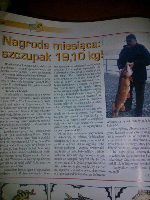 thibar Opublikowano 5 Lutego 2014 Zgłoś Udostępnij Opublikowano 5 Lutego 2014 (edytowane) Witam, Zakupiłem dzisiaj WW a tam rekordowy jak na nasze wody szczupak 19,10 kg. Ryba została złowiona 17. XI. 2013 r na zalewie w Szymanowicach i prawdopodobnie została zabita - nie znalazłem żadnej wzmianki o wypuszczeniu ryby. Na zabicie ryby wskazuje fakt, że została zważona w jakimś sklepie u kolegi. Niestety żyjemy ciągle w średniowieczu..Gazety o tematyce wędkarskiej zamiast wspierać wypuszczanie ryb. Interesować się losem okazu, to dają jakieś śmieszne nagrody - bo to jest nagroda miesiąca. Edytowane 5 Lutego 2014 przez tibhar Cytuj Odnośnik do komentarza Udostępnij na innych stronach Więcej opcji udostępniania...