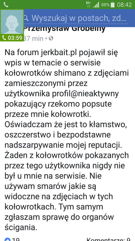 JKarp Opublikowano 22 Lutego 2018 Zgłoś Udostępnij Opublikowano 22 Lutego 2018 Witamy witamy :-)A nie mówiłem że się zaraz pojawią :-)To samo wytłumaczenie jak zawsze....Od maja Łukasza serwis ruszy pełną parą to dopiero niektórych zaboli :-)))Mam głęboko w d...co mówiłeś. Konto nie jest fackiem. Moje dane są prawdziwe. A teraz panowie podajcie swoje prawdziwe dane ? Podeślę swoje maszynki na serwis a potem po swojemu je poprawię i napiszę, że to wasza robota. Chciałbyś takiej konkurencji? Klientów się zdobywa rzetelnością i graniem w otwarte karty a nie pisaniem głupot po internetach.Czy myślisz ( o ile w ogóle ale śmiem twierdzić po tej zagrywce, że nie za bardzo ), że jesli komuś by tak zepsuto kołowrotek jak pokazujecie to by odpuścił? Nie opisałby tego choćby na FB ? JKarp Cytuj Odnośnik do komentarza Udostępnij na innych stronach Więcej opcji udostępniania...