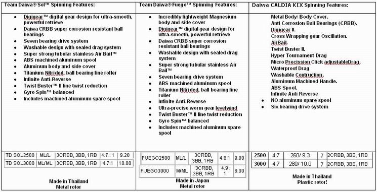 elpojo Opublikowano 31 Lipca 2008 Autor Zgłoś Udostępnij Opublikowano 31 Lipca 2008 Miałem ostatnio okazję w sklepie pokręcić Caldią 3500 w wydaniu Japońskim i Team Daiwą R4 (R4 zastąpił w tym roku model Advantage)Made in Thailand. Pracę przyrównałem do Stradica i TwinPowera 4000FB. Nie wiem jak porównanie wychodzi na rybach, na sucho urzekły mnie DAIWY! Kręciło się nimi jak w masełku, Shimańcami z kolei jakby w...gęstszej margarynie W międzyczasie zrewidowałem swoje potzreby i zdecydowałem że zakupię rozmiar 3000. Zrobiłem małe zestawienie finalistów: Pogrzebałem ponadto w zagranicznych forach i zdecydowałem się na Team Daiwę SOL 3000, zwycięstwo nad CALDIĄ dał metalowy rotor i zapasowa szpula. Amerykańscy koledzy stawiali go bezpośrednio poniżej CERTATE, być może na wyrost, tego nie wiem. Do FUEAGO od początku byłem uprzedzony...jako ciekawostkę dodam, że FUEGO zmenia desing na ten znany z TD, można sobie podpatrzyć tu: http://www.daiwa.com/Reel/spinning.aspx Cytuj Odnośnik do komentarza Udostępnij na innych stronach Więcej opcji udostępniania...