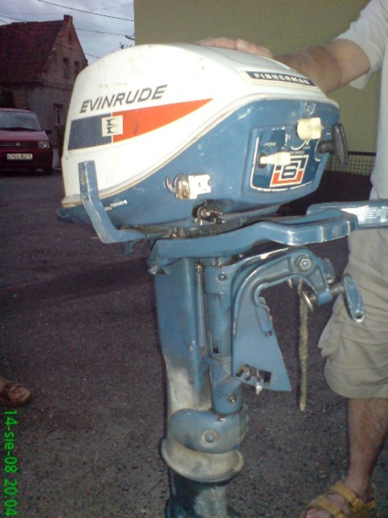 Dostałem w spadku taki oto silniczek - Evinrude 6KM, na oko pełnoletni. Nie chodził tak jak bym chciał więc fachmen rozebrał go i stwierdził, że uszkodzona jest cewka lub przewód od niej do jednej ze świec, a jako, że jest to zalane w jedną całość, potrzebuję kupić cewkę oraz dodatkowo jeden przerywacz.