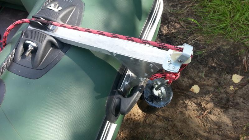 Potrzebuję uchwyt z dwoma rolkami, jedna za pawężą od strony silnika , a druga od środka pontonu. O właśnie tak i nawet już mam pomysł , chcąc wyrazić problem w słowach znalazłem chyba rozwiązanie. Rolka kotwiczna z knagą samozaciskową zamontowana w połowie na paweży,